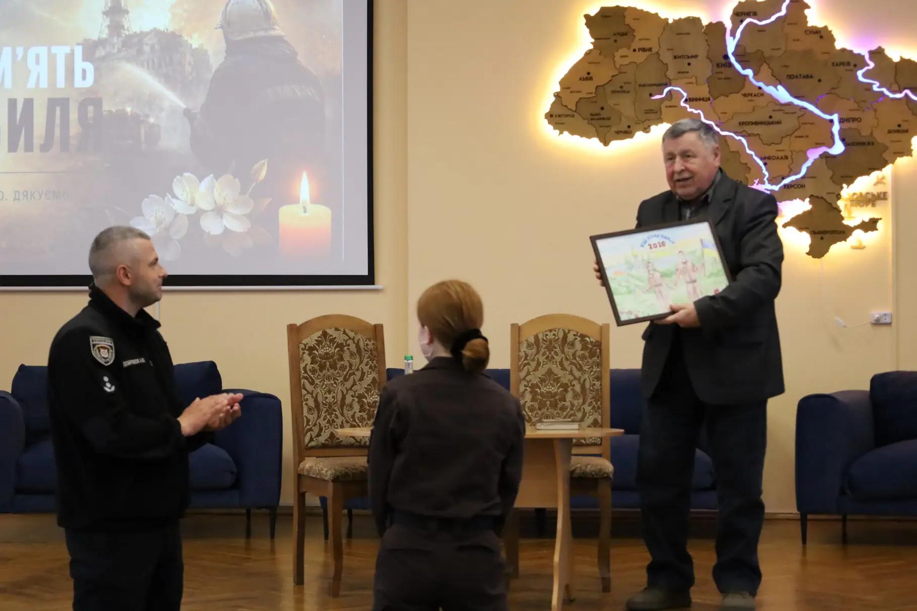 На завершення зустрічі ліцеїстка 2-го курсу підготувала для гостя подарунок — власноруч намальовану картину як символ вдячності, поваги та пам’яті, які молоде покоління зберігає і передає далі.